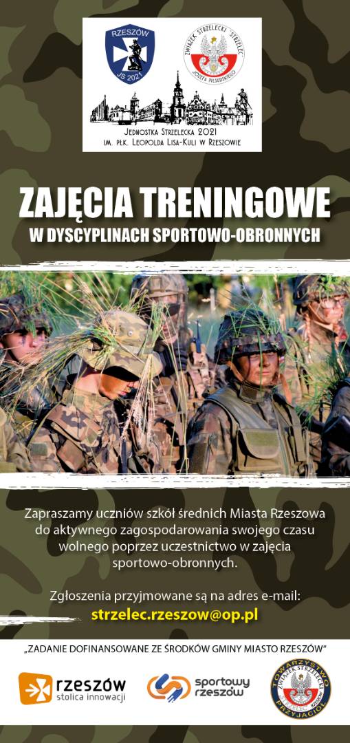 Zapraszamy uczniów szkół średnich Miasta Rzeszowa do aktywnego zagospodarowania swojego czasu wolnego poprzez uczestnictwo w zajęcia sportowo-obronnych. Organizatorem jest Towarzystwo Przyjaciół Związku Strzeleckiego "Strzelec" i Jednostka Strzelecka 2021 im. płk. L. Lisa-Kuli w Rzeszowie. Zgłoszenia przyjmowane są na adres e-mail: strzelec.rzeszow@op.pl
