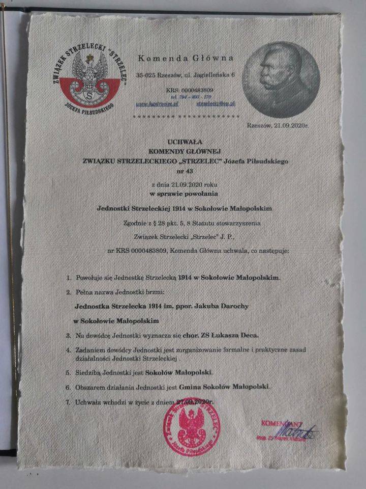 Uchwałą Komendy Głównej Związku Strzeleckiego „Strzelec” Józefa Piłsudskiego w dniu 27.09.2020 rozpoczęła swoją działalność Jednostka Strzelecka 1914 im. ppor. Jakuba Darochy w Sokołowie Małopolskim. Świętowanie tej podniosłej chwili rozpoczęliśmy mszą świętą w kościele parafialnym pod wezwaniem św. Jana Chrzciciela w Sokołowie Małopolskim. Mszy przewodniczył ksiądz proboszcz Jan Prucnal. Uroczystość uświetniła obecność wielu pocztów sztandarowych Jednostek Strzeleckich z Rzeszowa, Leżajska, Lubaczowa, Zamościa, Łańcuta oraz OSP w Sokołowie i miejscowych szkół. Oprawę muzyczną zapewniła Orkiestra Dęta z Mazurów.