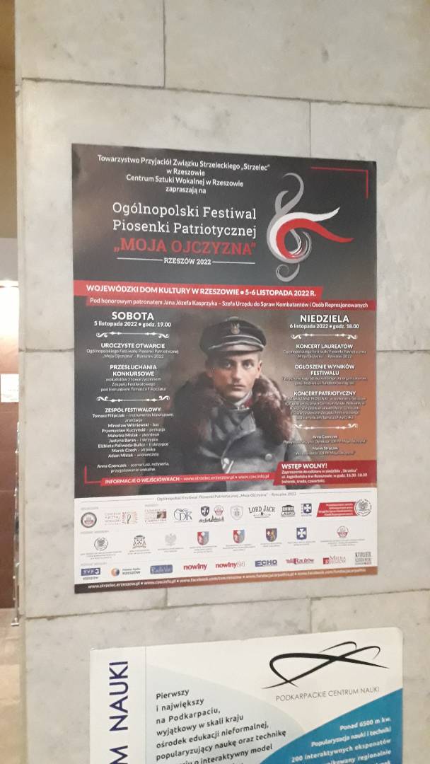 W dniu 5.11.2022 r w sali widowiskowej WDK w Rzeszowie odbyło się Uroczyste Otwarcie I Ogólnopolskiego Festiwalu Piosenki Patriotycznej „Moja Ojczyzna” Rzeszów 2022 oraz Przesłuchania Konkursowe.