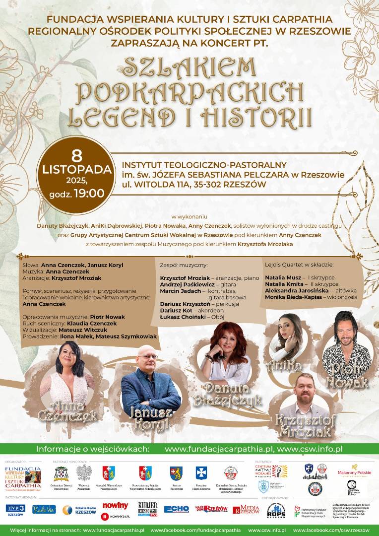 Fundacja Wspierania Kultury i Sztuki Carpathia ma zaszczyt zaprosić na koncert: „Szlakiem Podkarpackich Legend i Historii”– wydarzenie łączące ludzi, emocje i pokolenia Data: 8 listopada 2025 r. Godzina: 19:00. Miejsce: Instytut Teologiczno-Pastoralny im. św. Józefa Sebastiana Pelczara w Rzeszowie.