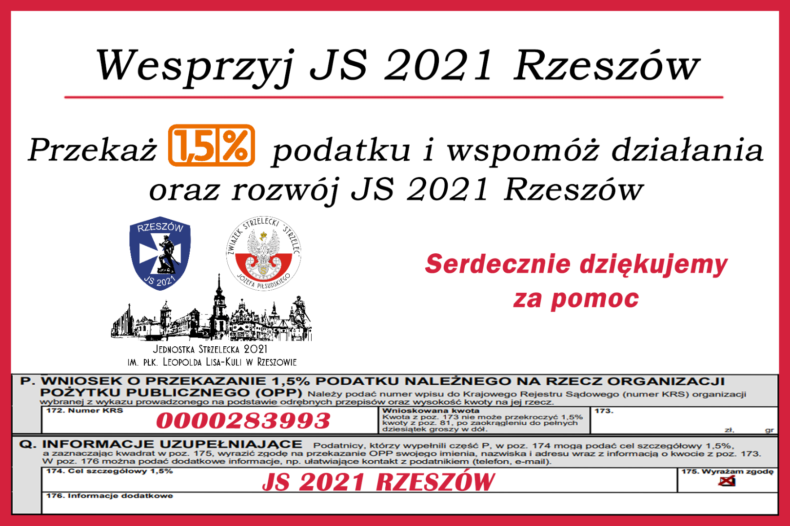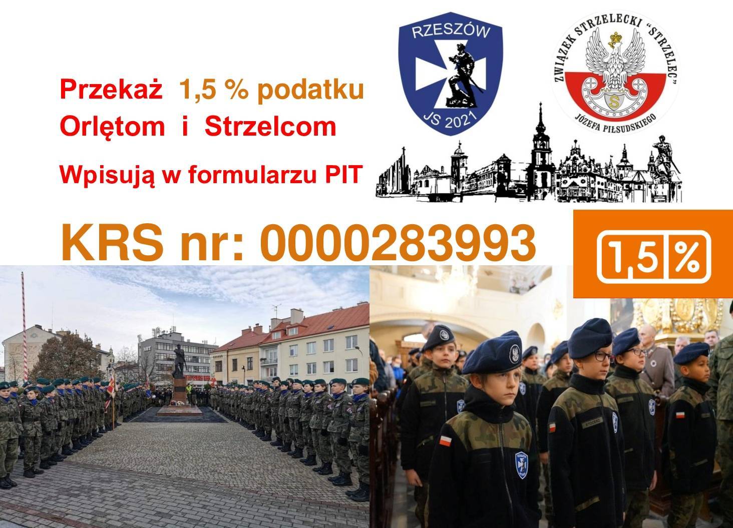 Towarzystwo Przyjaciół Związku Strzeleckiego „Strzelec” w Rzeszowie zwraca się z prośbą o przekazanie 1% podatku naszym Orlętom i Strzelcom Jednostki Strzeleckiej 2021 im. płk. Leopolda Lisa-Kuli w Rzeszowie, wpisując w zeznaniu podatkowym PIT nasz numer KRS: 0000283993. Cel szczegółowy 1,5%: cele statutowe.